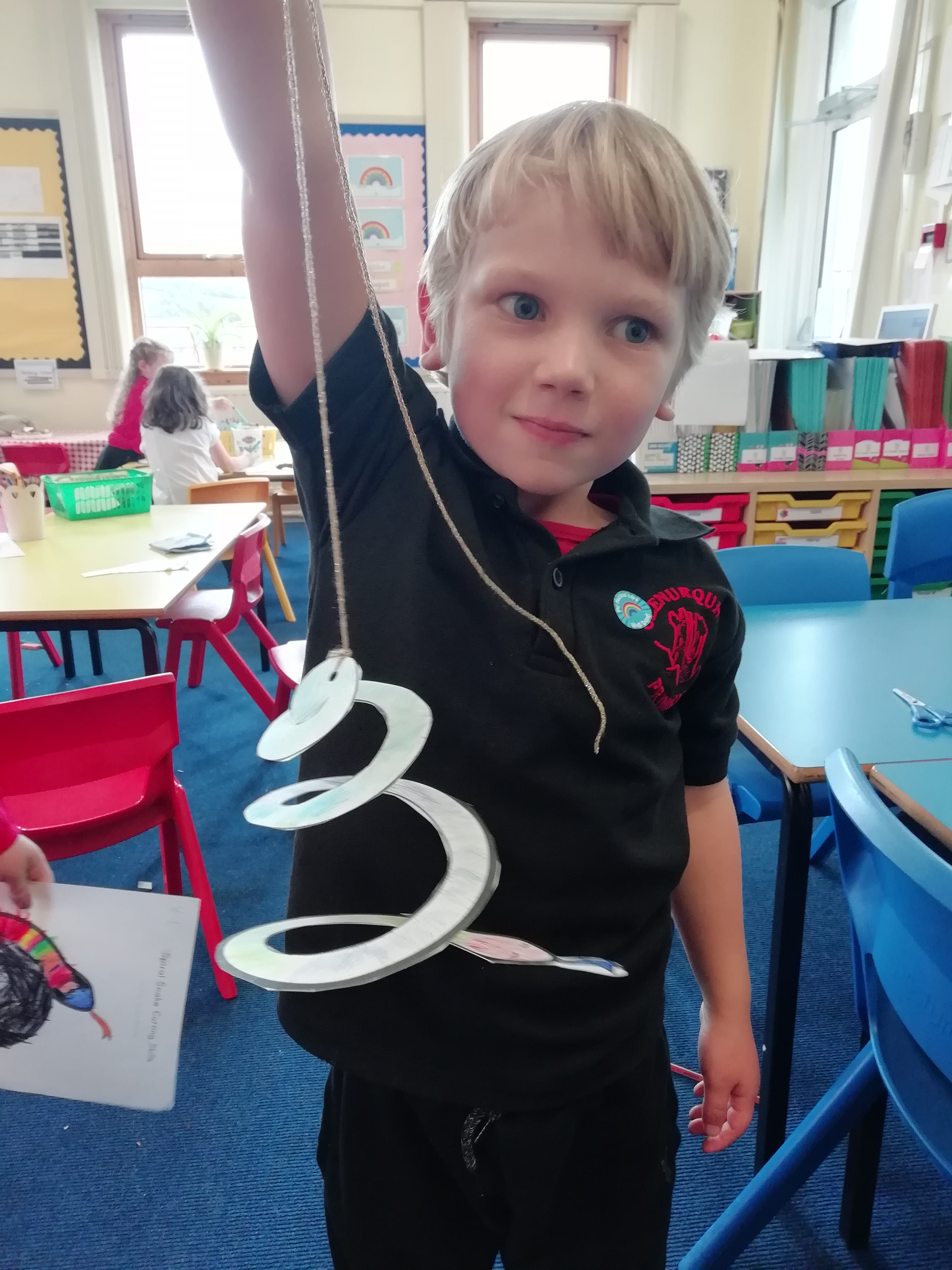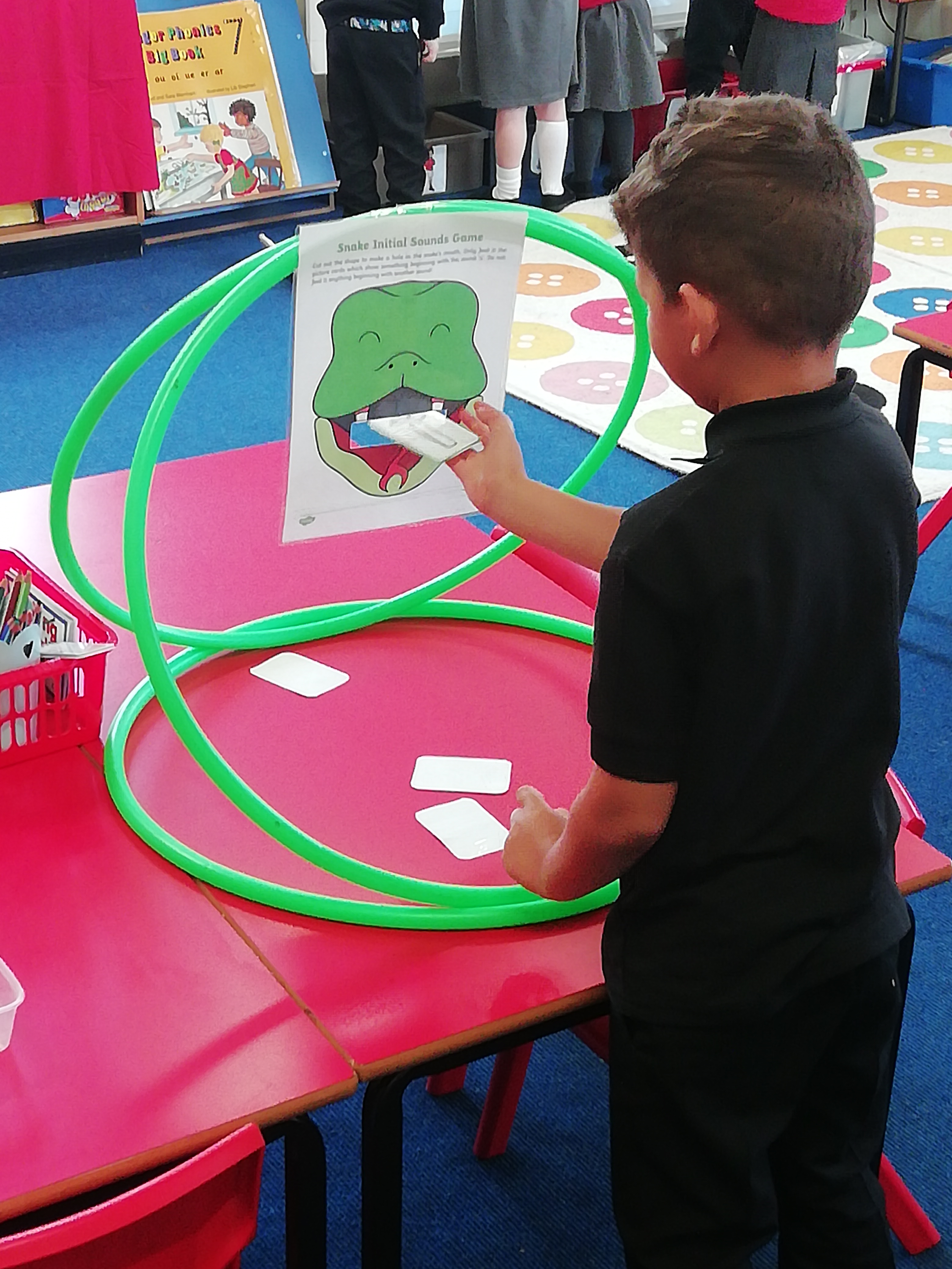 P1 have been learning their first sound this week. We started with the S sound. Today we posted pictures beginning with the S sound into Sammie the Snake’s mouth and made hanging snakes.