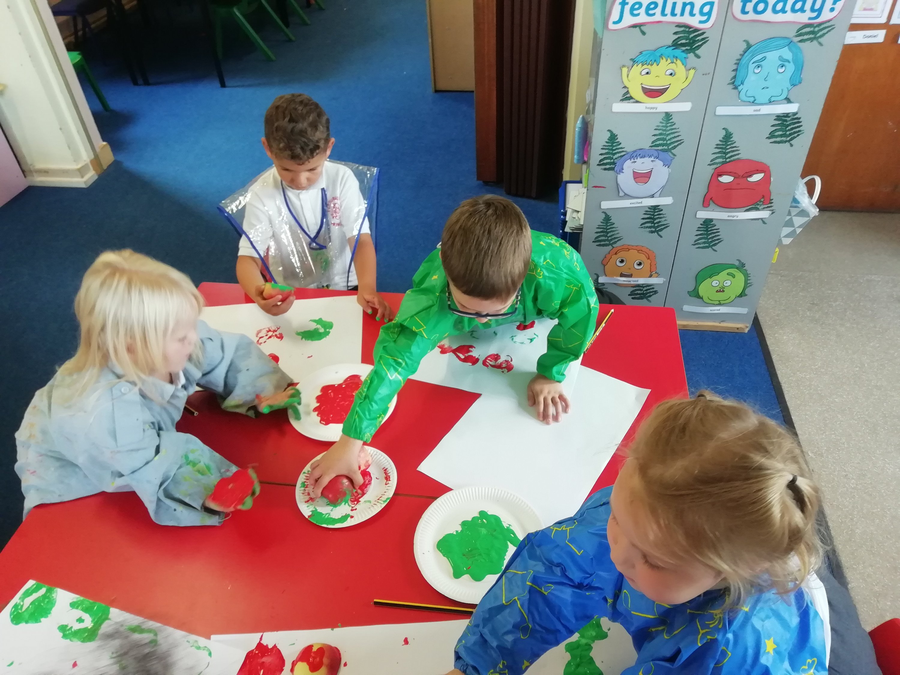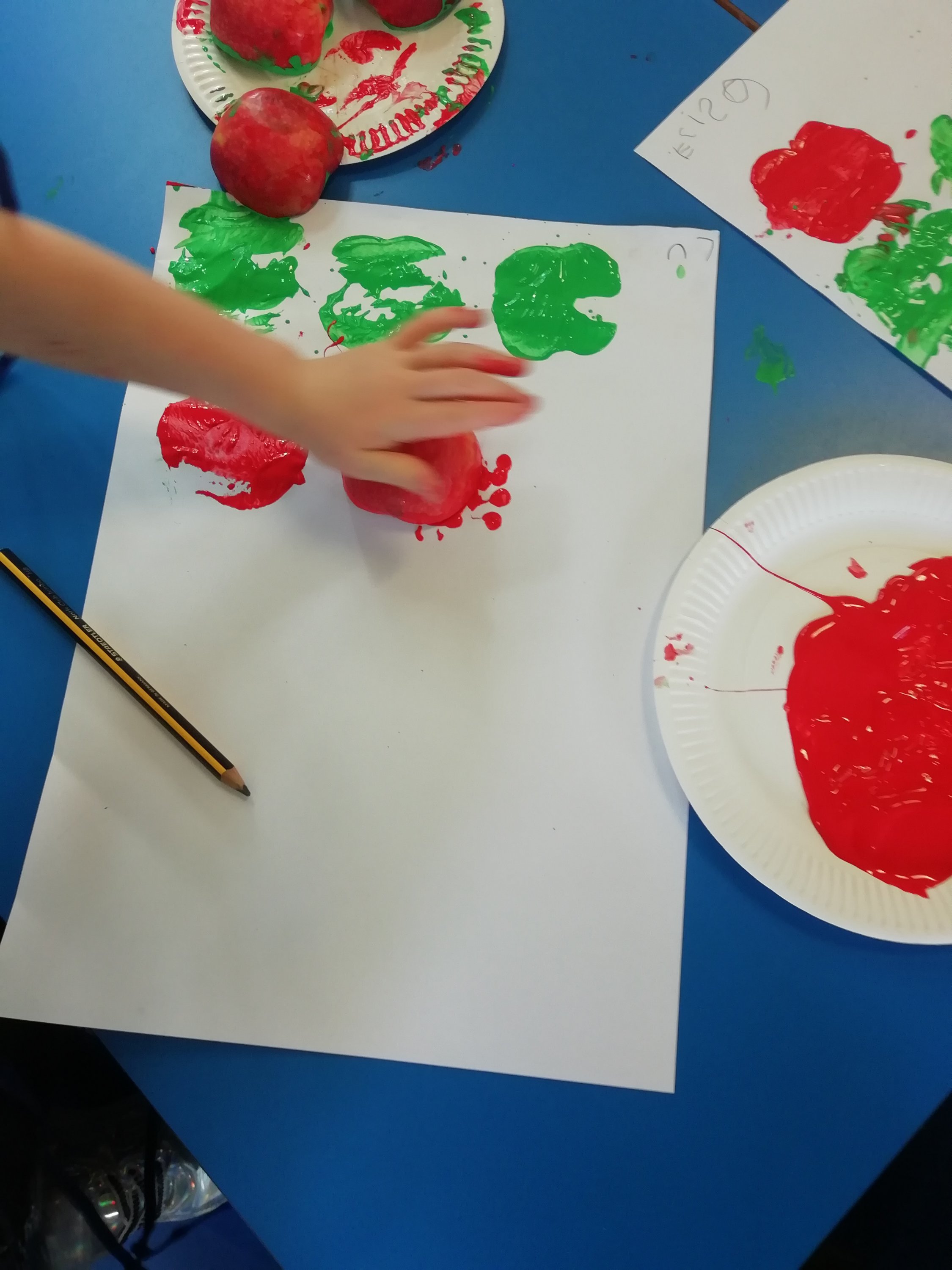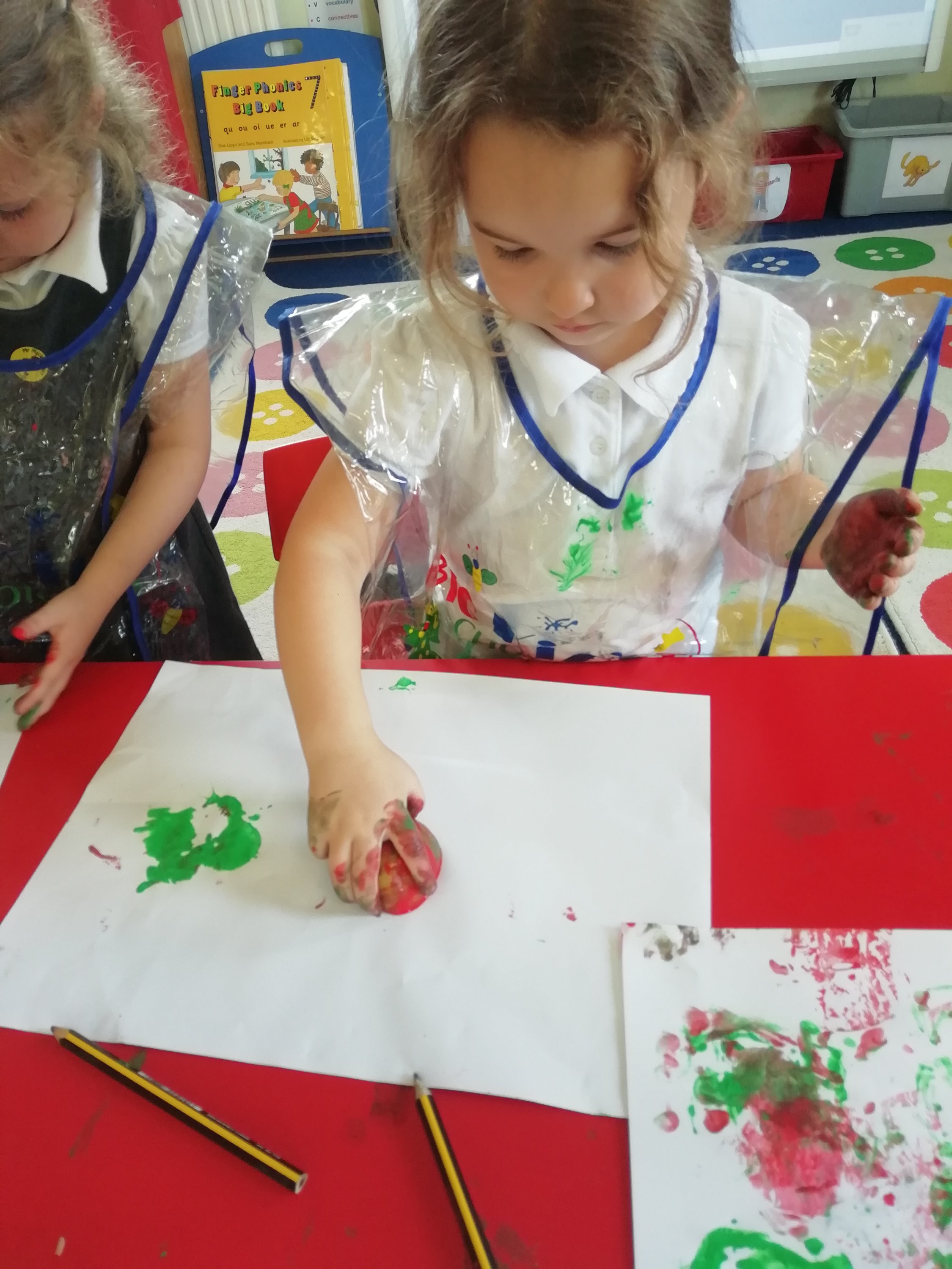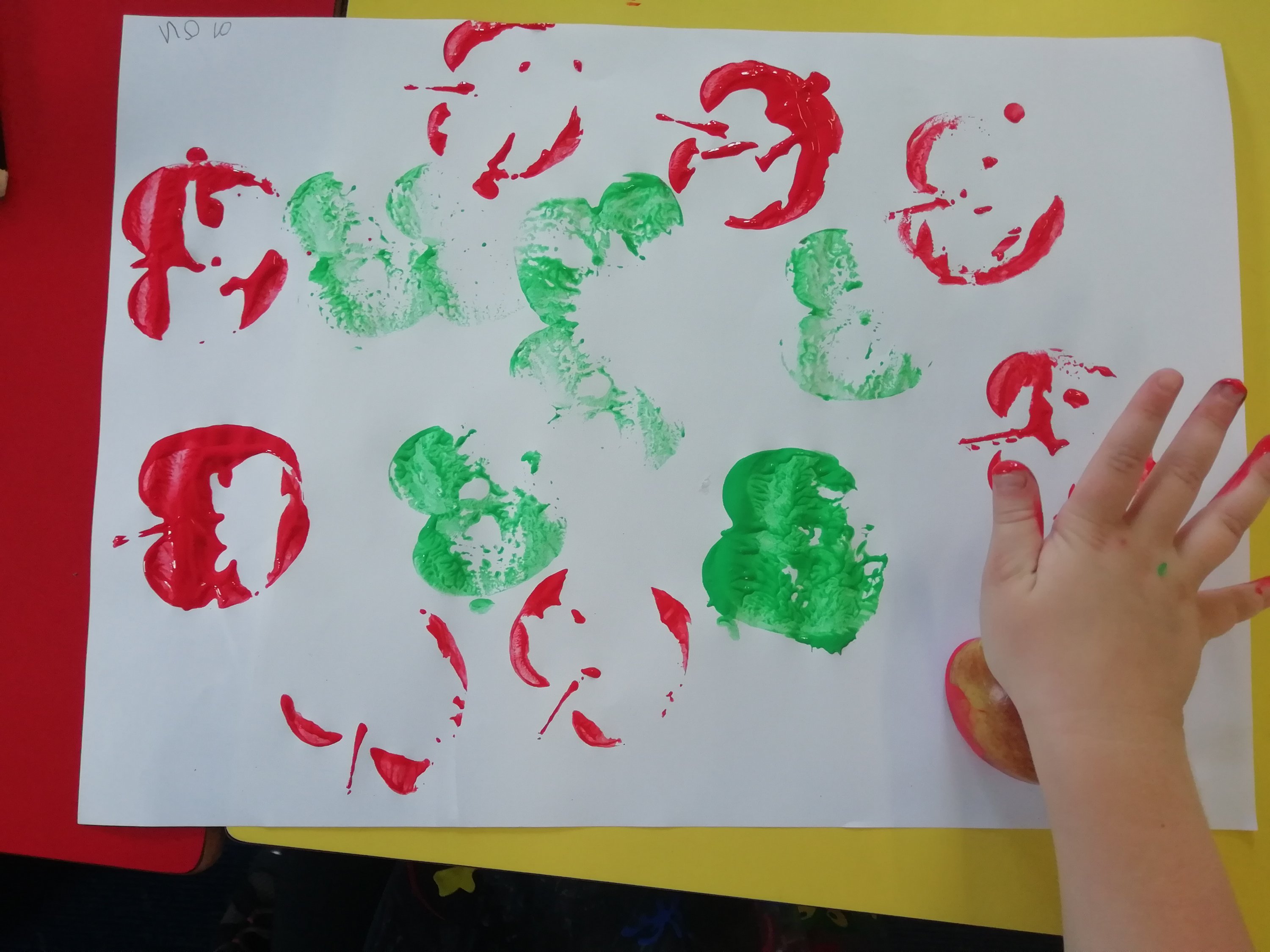 Today we looked at the “a” sound. We sang our Jolly Phonics song about ants on our arm and learned the action. We watched Mr Macleod’s friend Geraldine the Giraffe on the SMART Board and used apples to print pattern using green and red paint.